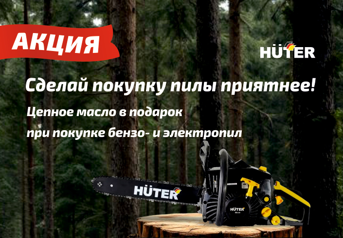 При покупке пил из ассортимента Huter, цепное масло в подарок.*